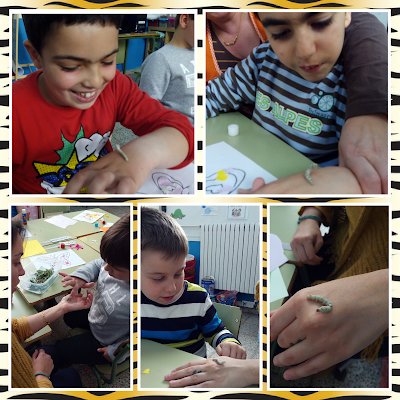 Ayer estuvimos tocando nuestros gusanitos de seda. Igual que en el cuento de la pequeña oruga glotona, nuestras pequeñas orugas, como se pasan el día comiendo, se han hecho ya grandes y gordas. Algunas pronto empezarán a hacer el capullo. Ya tenemos muchas ganas de verlos!!